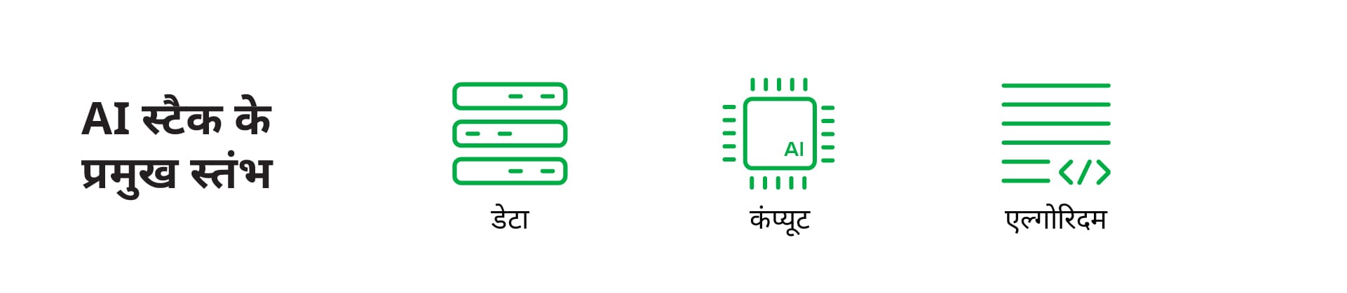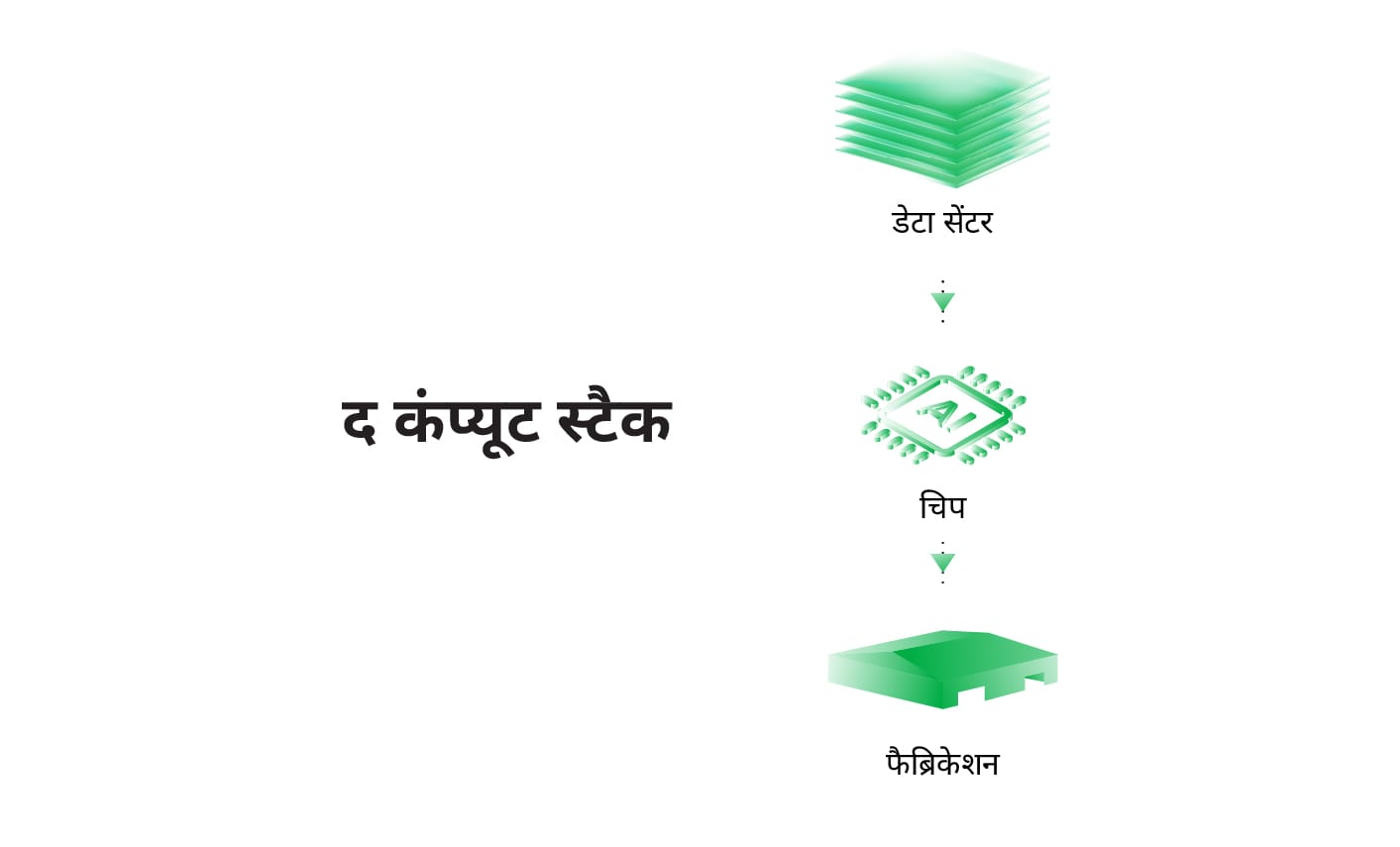 भविष्य में कंप्यूट स्टैक में AI फैक्ट्रियां (डेटा सेंटर) और आधुनिक फ़ैब में बने AI चिप्स शामिल होंगे। ये AI फैक्ट्रियां बहुत महत्वपूर्ण होंगी, क्योंकि जिन देशों की कंप्यूटिंग क्षमता ज्यादा होगी, वे AI के क्षेत्र में आगे बढ़ेंगे। अभी, भारत में केवल १ GW डेटा सेंटर क्षमता है, जबकि पूरी दुनिया की क्षमता ५० GW है। अगर हम इसी रफ्तार से चलते रहे, तो २०३० तक अमेरिका में ७० GW, चीन में ३० GW और भारत में ५ GW डेटा सेंटर क्षमता होगी। प्रति व्यक्ति कम्प्यूट खपत भी यही दर्शाता है, भारत १० डॉलर, चीन १०० डॉलर, और अमेरिका १००० डॉलर पर है। हालांकि हमें अभी बहुत आगे बढ़ना है, लेकिन यह विकास के लिए एक महत्वपूर्ण अवसर भी प्रदान करता है।