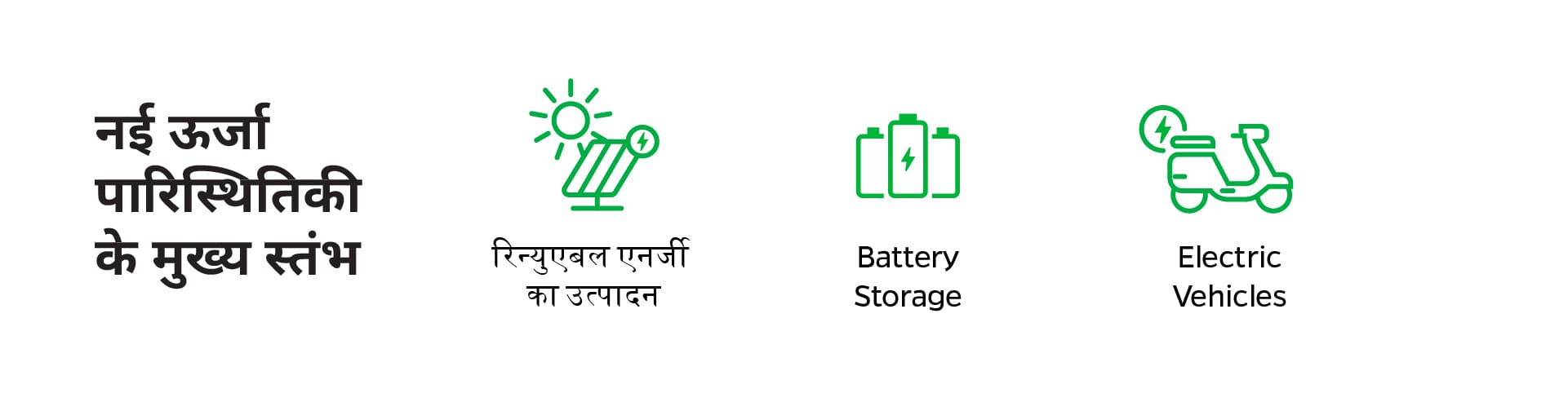 न्यू एनर्जी का पूरा सिस्टम तीन मुख्य हिस्सों पर टिका है: रिन्युएबल एनर्जी उत्पादन (RE), बैटरी स्टोरेज, और इलेक्ट्रिक वाहन (EVs)। ये हर क्षेत्र भारत के लिए बड़े मौके और चुनौतियां दोनों लेकर आते हैं।