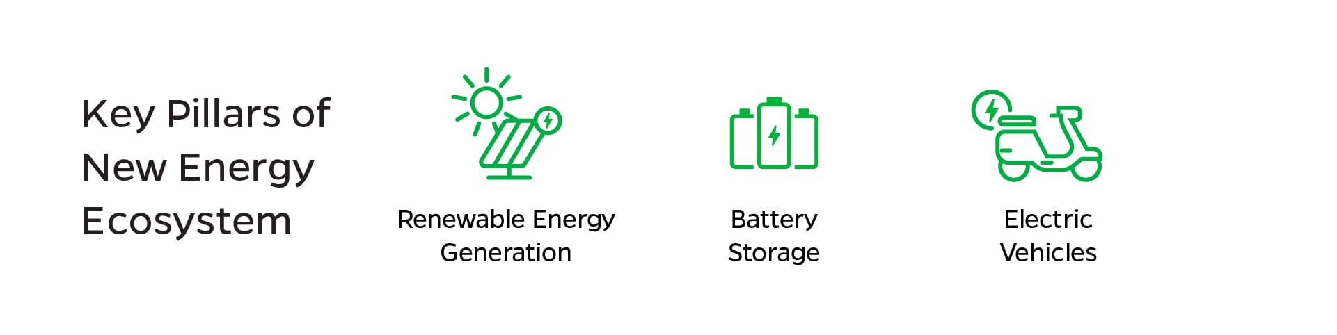 The new energy ecosystem rests on three pillars: Renewable Energy Generation (RE), Battery Storage, and Electric Vehicles (EVs). Each of these sectors presents unique opportunities and challenges for India.